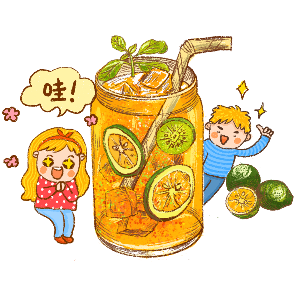 3.青桔切掉頭,橫豎切兩刀,擠汁至杯中。