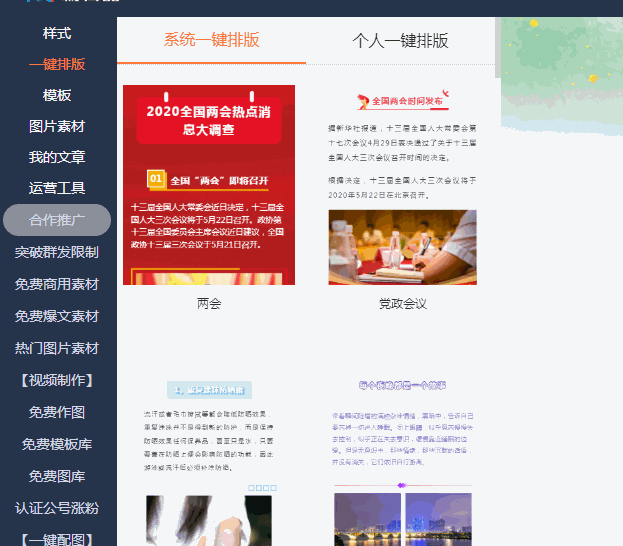目前『系統(tǒng)一鍵排版』中有簡約風、文藝風、雜志風、家居風、新聞風、黨政風等多種風格的模板供胖友們選擇。