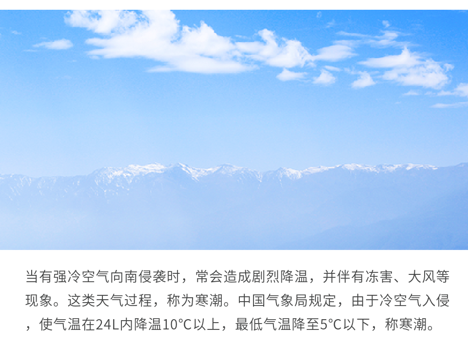 文案參考:當(dāng)有強(qiáng)冷空氣向南侵襲時(shí),常會(huì)造成劇烈降溫,并伴有凍害、大風(fēng)等現(xiàn)象。這類天氣過(guò)程,稱為寒潮。中國(guó)氣象局規(guī)定,由于冷空氣入侵,使氣溫在24L內(nèi)降溫10℃以上,最低氣溫降至5℃以下,稱寒潮。
