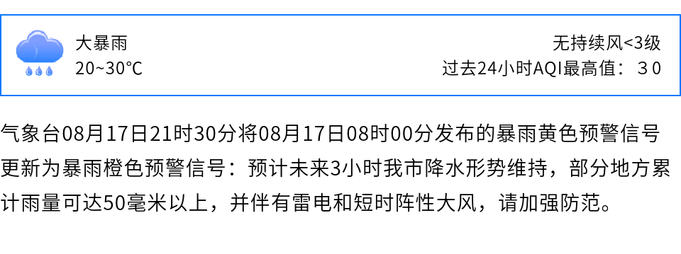 文案參考:氣象臺(tái)08月17日21時(shí)30分將08月17日08時(shí)00分發(fā)布的暴雨黃色預(yù)警信號(hào)更新為暴雨橙色預(yù)警信號(hào):預(yù)計(jì)未來(lái)3小時(shí)我市降水形勢(shì)維持,部分地方累計(jì)雨量可達(dá)50毫米以上,并伴有雷電和短時(shí)陣性大風(fēng),請(qǐng)加強(qiáng)防范。