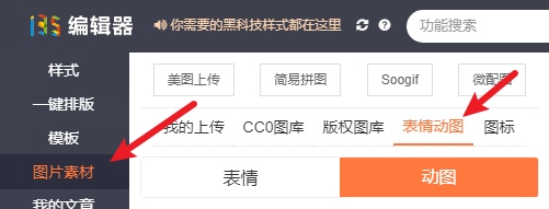 我們首先打開(kāi)135編輯器官網(wǎng),登錄之后,點(diǎn)擊左側(cè)的【圖片素材】-【表情動(dòng)圖】。