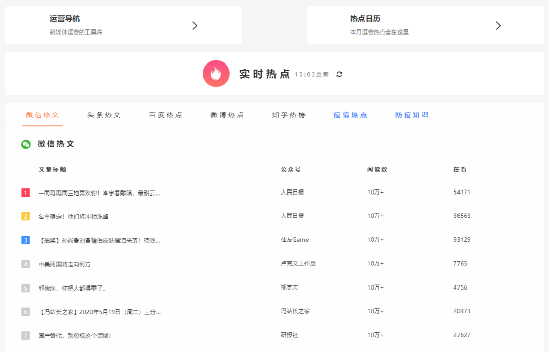 這里不僅有微信熱文、頭條熱文、百度熱點(diǎn)、微博熱點(diǎn)、知乎熱榜,還搜羅了大家非常關(guān)注的疫情熱點(diǎn)、防疫知識(shí)。這個(gè)網(wǎng)站里都集合齊全了,大家就不必一個(gè)一個(gè)去翻查。想要追熱點(diǎn)原來這么簡單。