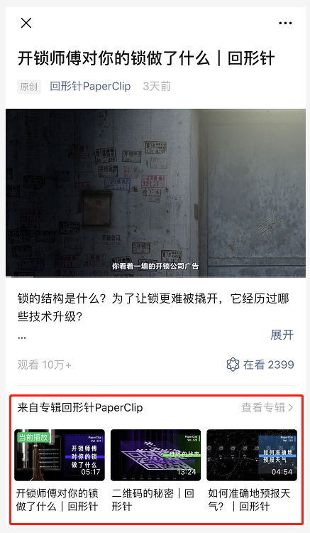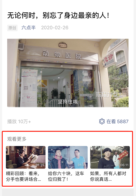 通過當(dāng)前視頻設(shè)置延伸觀看合集內(nèi)容,微信公眾號運營者可根據(jù)需求添加專題分類視頻到專輯并展示在群發(fā)頁面,同時可增強(qiáng)歷史視頻內(nèi)容的曝光和傳播。注:如視頻設(shè)置過“觀看更多”,加入到視頻專輯后優(yōu)先展示視頻專輯。