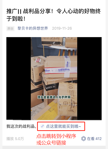 微信公眾號視頻自定義貼片是一種顯示在視頻畫面上的可點擊卡片,可以用來引導(dǎo)用戶在觀看視頻的過程中跳轉(zhuǎn)到小程序。群發(fā)視頻消息時,可以設(shè)置貼片出現(xiàn)的時間、引導(dǎo)文案和跳轉(zhuǎn)小程序路徑,延伸多種場景玩法。