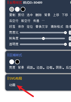 3、在編輯區(qū)內(nèi)點(diǎn)擊樣式,在彈出的菜單欄中點(diǎn)擊【SVG布局動畫】