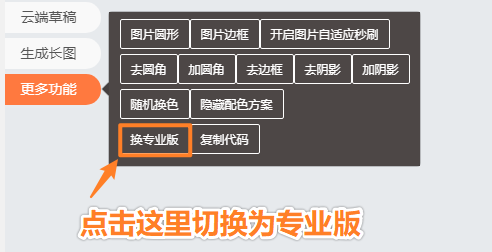 1.首先將編輯器切換至專業(yè)版,點(diǎn)擊右側(cè)『更多功能』,在彈出的菜單中選擇『切換專業(yè)版』,即可將編輯器切換為專業(yè)版。