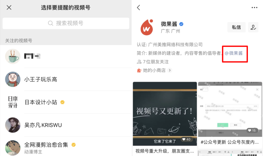 10月12日,視頻號新增賬號簡介“@視頻號賬號”功能,創(chuàng)作者在填寫簡介時(shí)可直接@別人,被@的視頻號將會以藍(lán)字出現(xiàn)在簡介上,點(diǎn)擊會跳轉(zhuǎn)到被@視頻號的關(guān)注主頁。