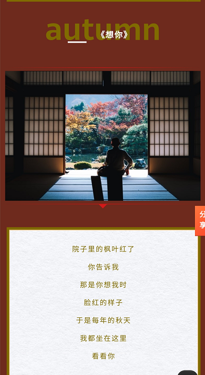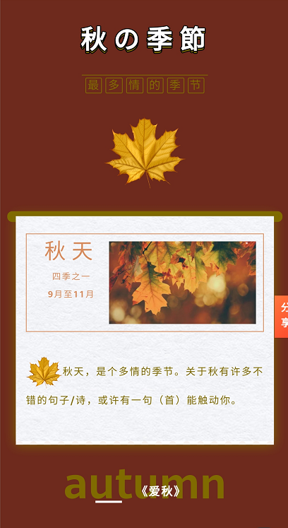 一份秋的排版,沒有用繁復(fù)的樣式,只是一個背景色,搭配黃色的楓葉元素,就呈現(xiàn)出濃濃的深秋氛圍,排版簡潔明了,主題鮮明,色彩搭配適宜,當(dāng)之無愧好排版!