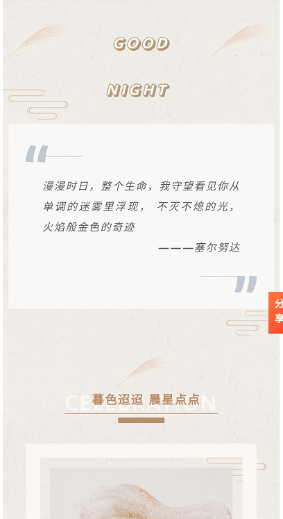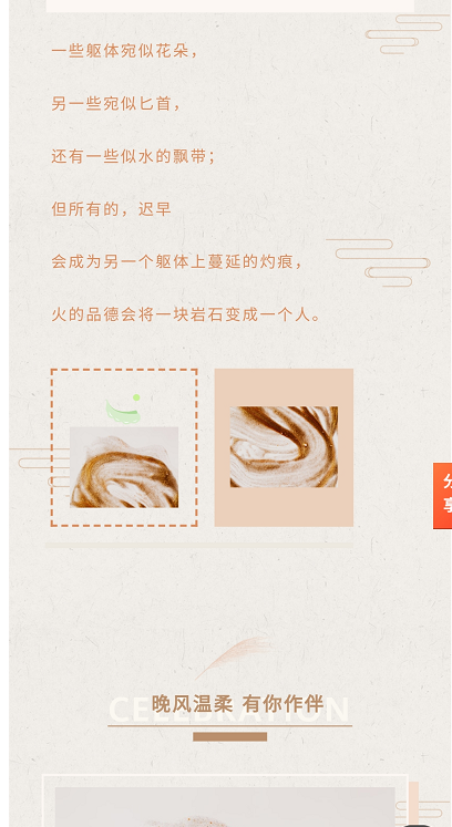 下面這篇排版在背景上做了很多小心思,把135編輯器樣式中的蘆葦和線條元素保存下來,制成了獨一無二的背景,再搭配同色調(diào)淺橙色的文字,色調(diào)高度統(tǒng)一,帶來了美的視覺享受。