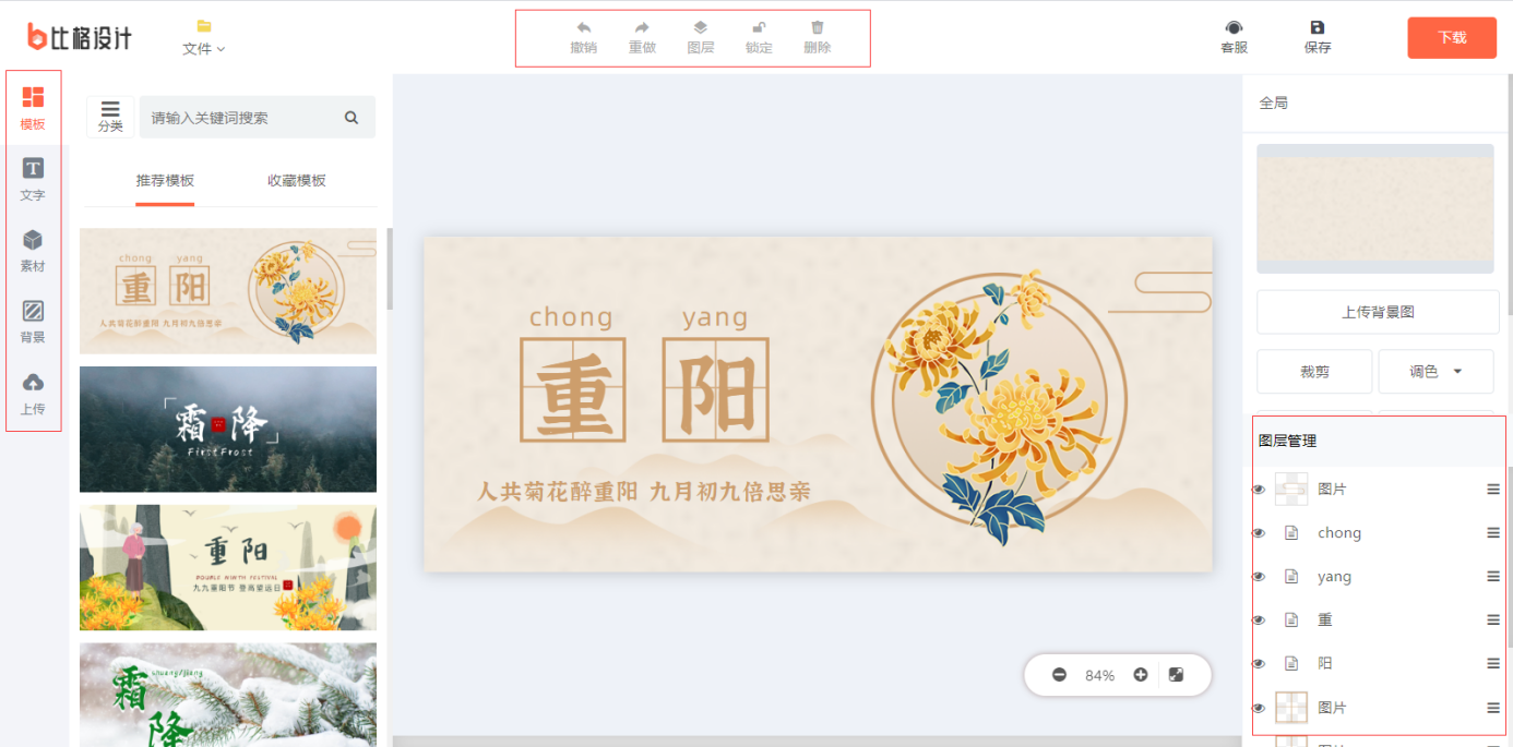選中圖片模板編輯后,會跳轉(zhuǎn)到圖片設(shè)計詳情頁里,左側(cè)有模板切換、文字樣式、素材元素、背景圖顏色切換、本地圖片上傳。中間有:圖片上一步和下一步操作,鎖定或者刪除圖層。右側(cè)是圖層管理。