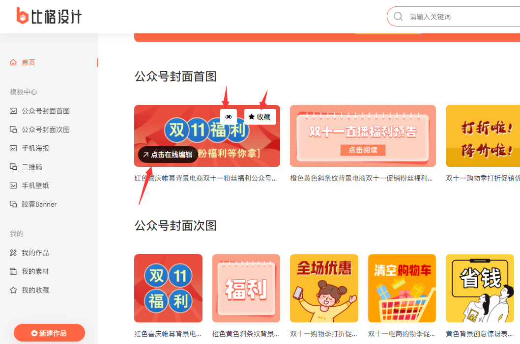 選中自己喜歡的圖片模板,點擊圖片上的"在線編輯"位置,即可開始制作圖片素材。小眼睛圖標(biāo)是指查看當(dāng)前圖片素材樣式,喜歡還可以點擊旁邊的收藏,會保存到我的收藏里,隨時可調(diào)用。