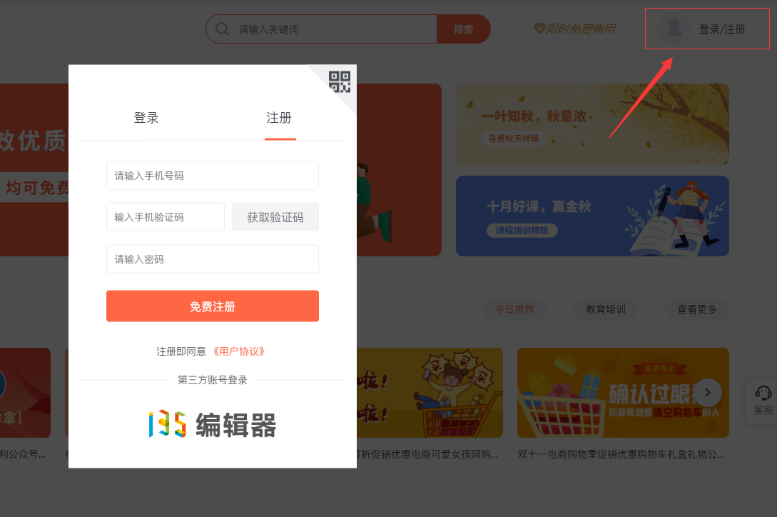 在比格設(shè)計官網(wǎng)頁面,點擊右上角的“登錄/注冊”賬號,目前支持微信掃碼和手機號碼一鍵注冊登錄,和第三方賬號"135編輯器"賬號綁定直接登錄。