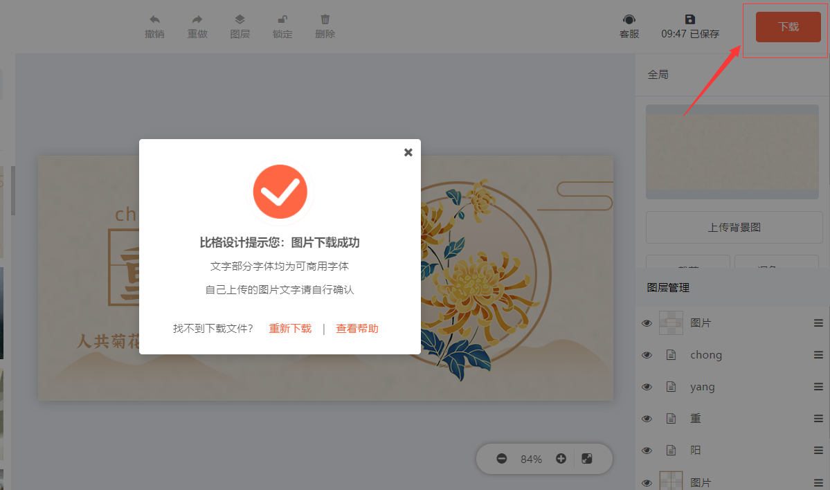 圖片編輯設(shè)計好后,點擊右側(cè)頂部的下載按鈕,即可直接網(wǎng)頁在線自動合成圖片,下載到本地電腦上進行保存。
