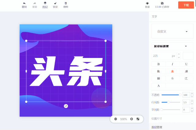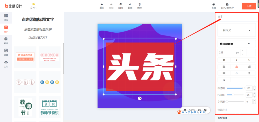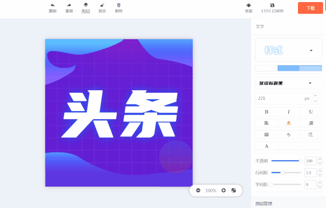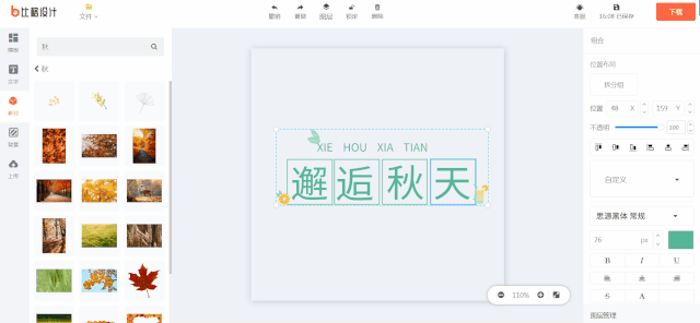 圖片編輯頁(yè)面中,選中字體,右側(cè)即跳出文字設(shè)置。