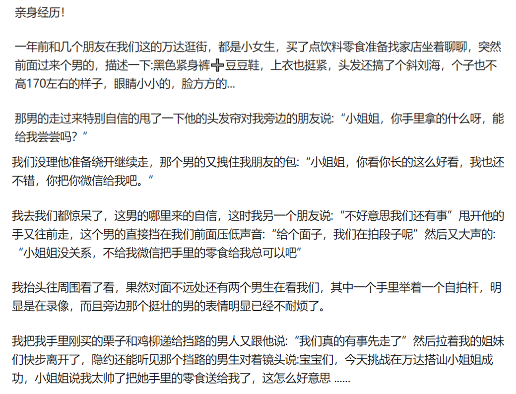 這種為偷拍視頻而存在的搭訕,對被搭訕者來說,是一種困擾,甚至是一種性騷擾。
