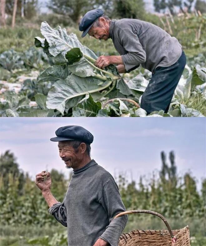 藍(lán)色的帽子,花白的頭發(fā),黝黑的皮膚,以及有了褶皺多的臉龐,都是典型的農(nóng)民伯伯的形象。