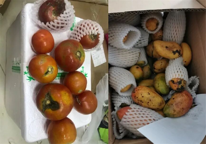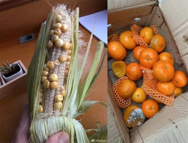 評(píng)論中也有不少人跟著曬出自己收到的產(chǎn)品,結(jié)果一箱水果,一小半都是爛的,玉米“偷工減料”。難道是快遞的過程中被蟲子吃了?