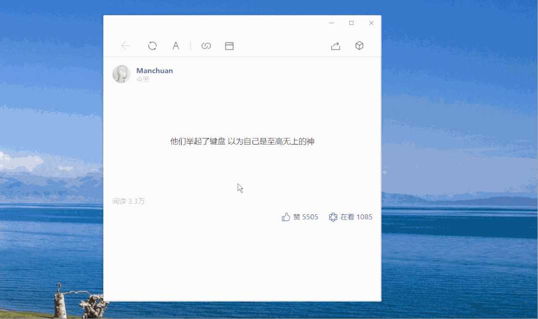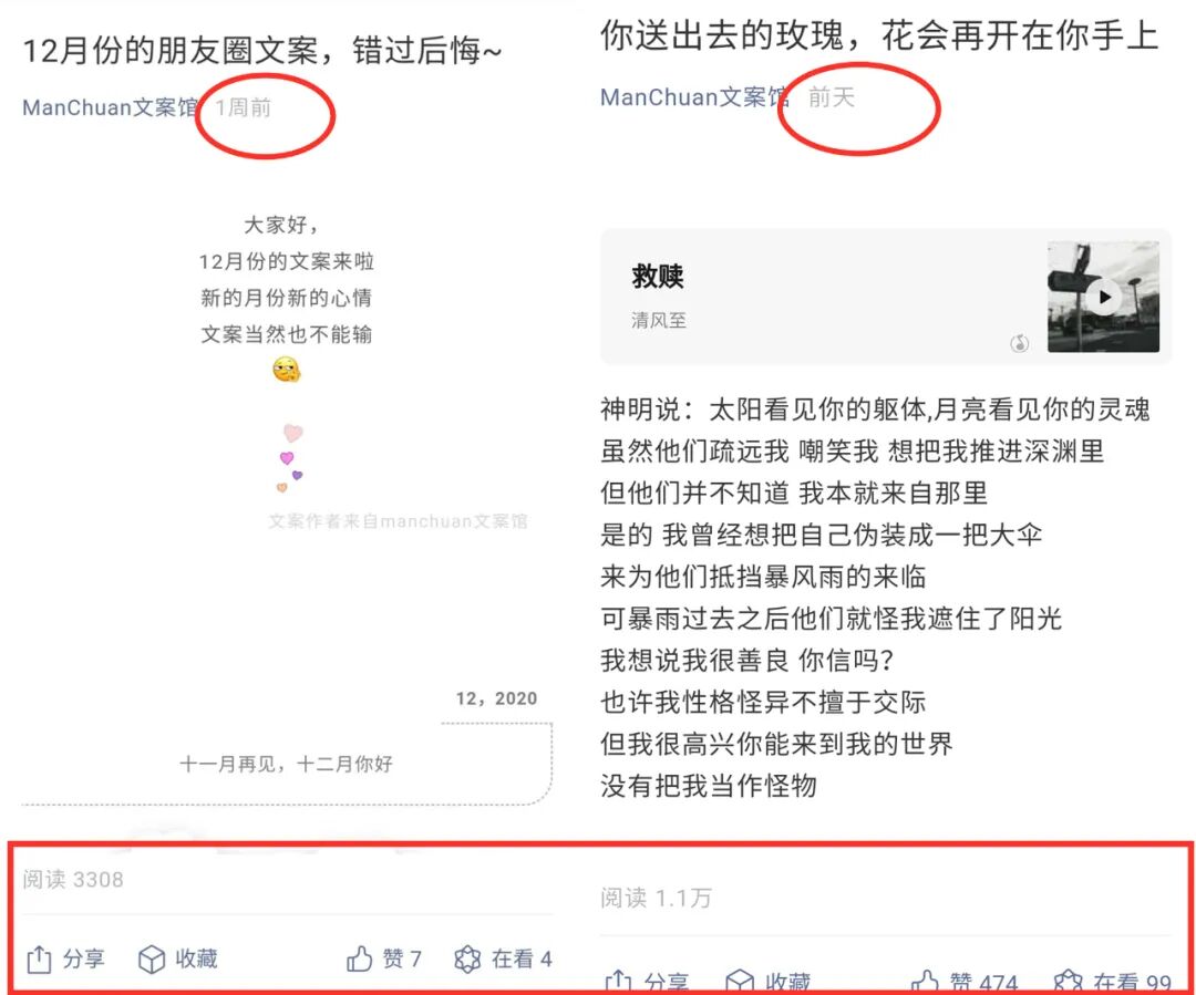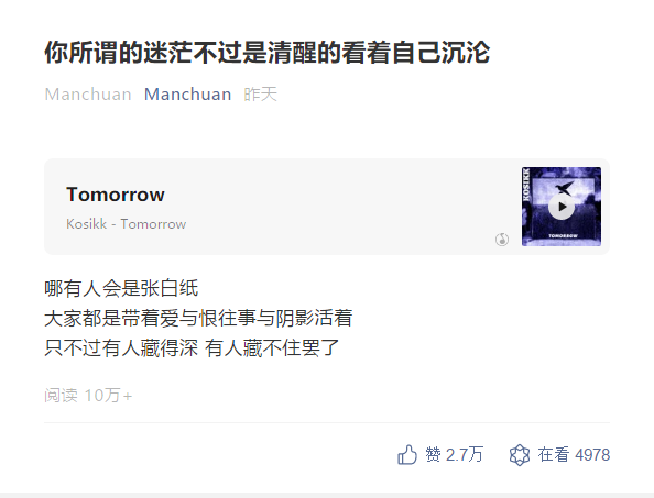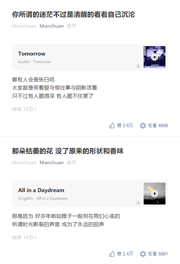 更加不可思議的是,公眾號(hào)「Manchuan」的文章特別短。每天只發(fā)布幾句文案,就斬獲了10W+閱讀,幾萬(wàn)點(diǎn)贊。