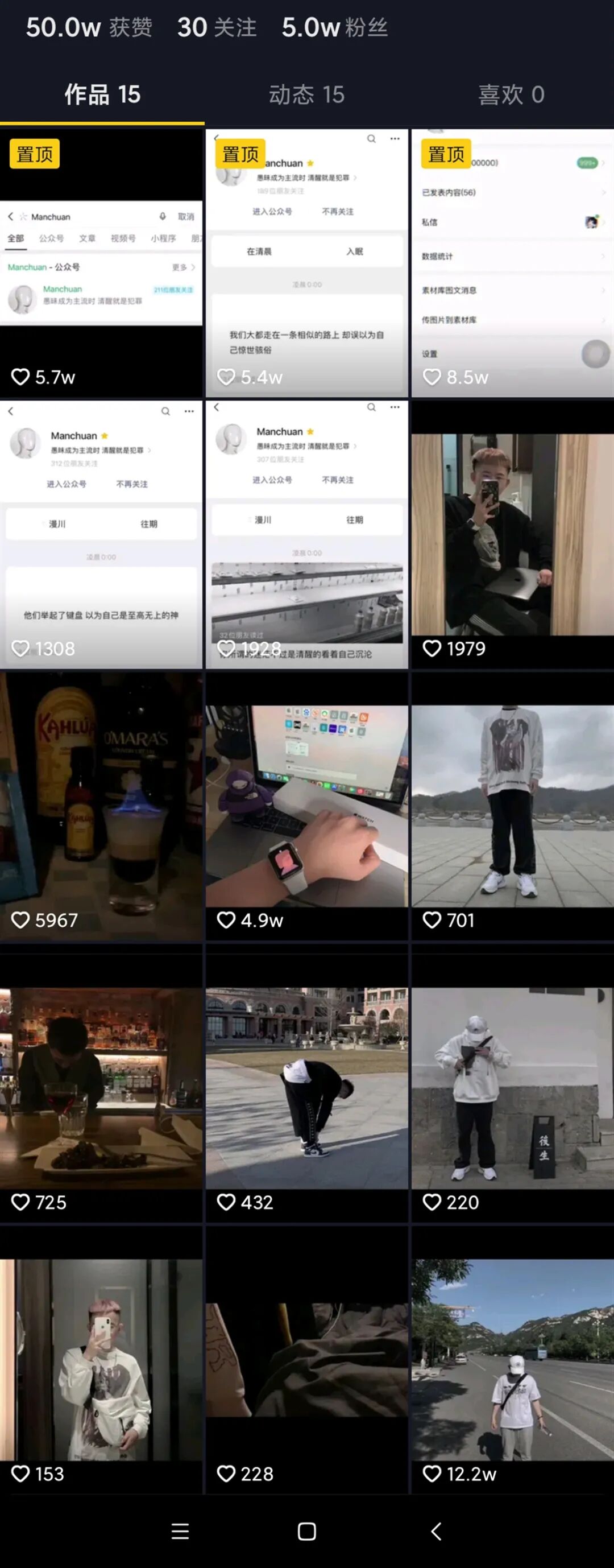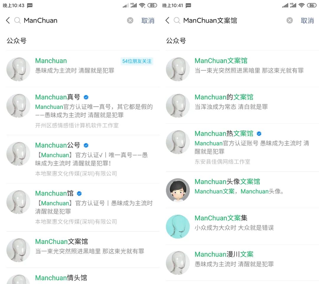 兩條點(diǎn)贊超過(guò)5萬(wàn)的視頻,介紹了公眾號(hào)名稱(chēng),并且展示了公眾號(hào)「Manchuan」的文案。