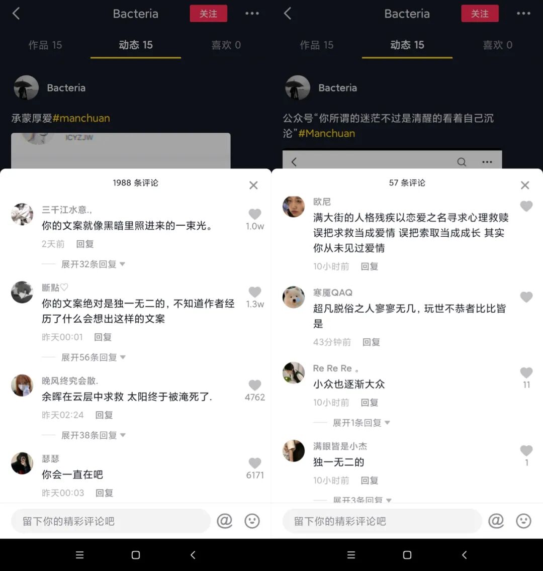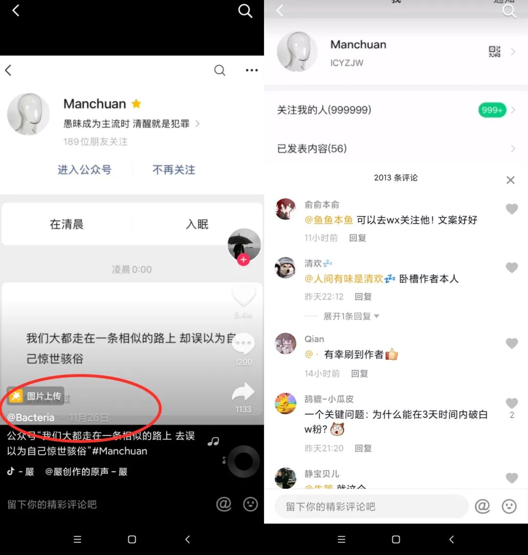 只不過(guò)@Bacteria通過(guò)這種喪文案,在抖音上制造了爆款,創(chuàng)造了一種漲粉模式,給公眾號(hào)導(dǎo)流。山寨號(hào)模仿它,并截取了抖音來(lái)的流量。