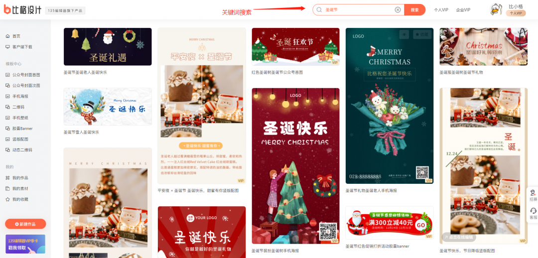 打開電腦瀏覽器,在地址欄輸入比格設(shè)計官網(wǎng)地址(https://bigesj.com/),打開之后搜索關(guān)鍵詞:圣誕節(jié) 即可找到相關(guān)主題模板;或者通過點擊首頁圣誕節(jié)專欄使用。