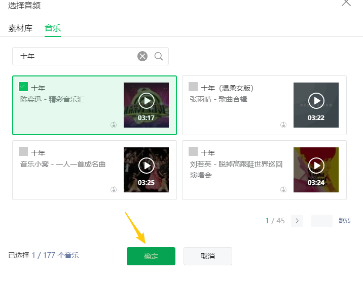 在彈出的頁面中點(diǎn)擊『音樂』欄,搜索你想要的歌曲,點(diǎn)擊確定即可成功添加。