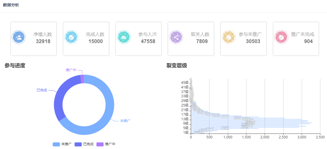 企微裂變活動可設(shè)置多階玩法,刺激粉絲老帶新;可自定義粉絲標(biāo)簽,把參與活動的粉絲放在單獨的標(biāo)簽組,以便精細(xì)化運營。在工具后臺還可以實時查看活動數(shù)據(jù),追蹤粉絲參與詳情。