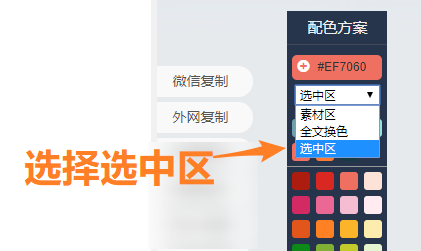 1.將樣式插入至編輯器,點(diǎn)擊選中樣式,然后點(diǎn)擊右側(cè)配色方案下的 ▼,選擇『選中區(qū)』。