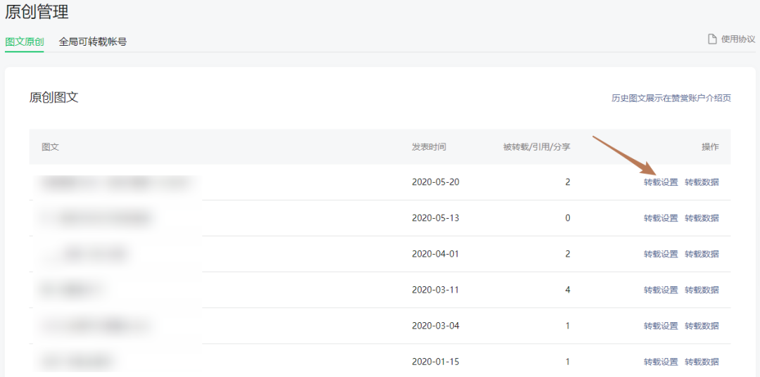 2、根據(jù)文章日期找到對(duì)方申請(qǐng)開白的文章,點(diǎn)擊【轉(zhuǎn)載設(shè)置】。