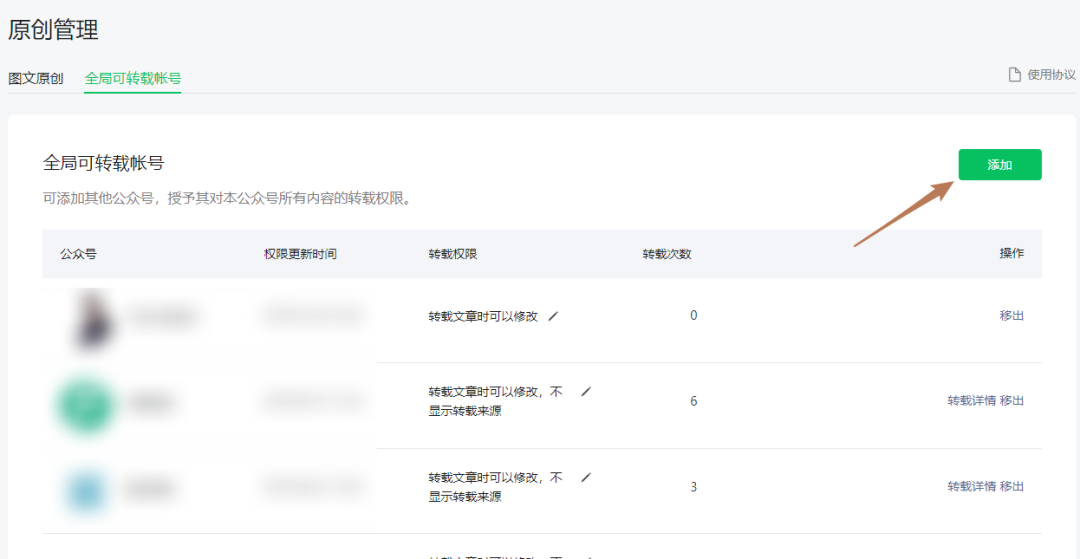 如果要把對(duì)方加入長(zhǎng)期白名單,則點(diǎn)擊【全局可轉(zhuǎn)載賬號(hào)】,然后添加相應(yīng)的公眾號(hào)即可。