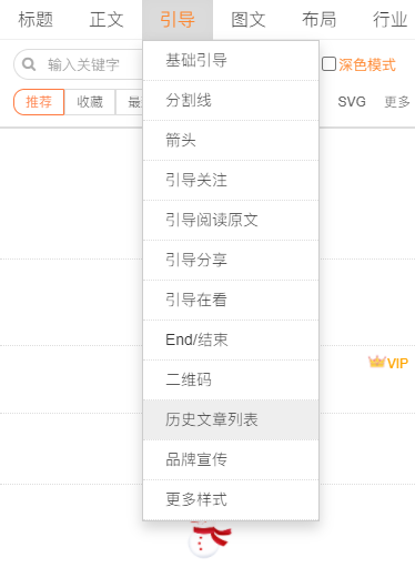 一、完成微信公眾號(hào)文章主體的編輯和排版之后,在樣式欄的【引導(dǎo)】目錄中,點(diǎn)擊選擇【歷史文章列表】,挑選一個(gè)你喜歡的樣式。