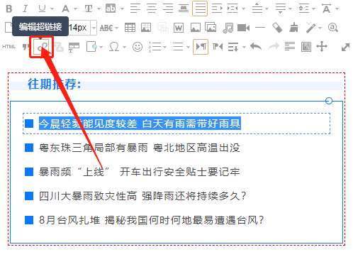 在上面給大家分享的微信公眾號(hào)雨水樣式和模板中,有一個(gè)雨水的往期推薦樣式,使用這個(gè)樣式時(shí),要用到135編輯器中的添加超鏈接的功能,大家可以根據(jù)以下教程的步驟來進(jìn)行排版: