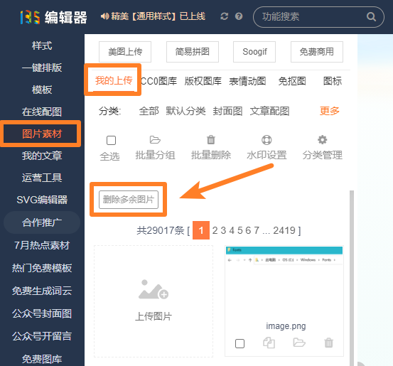這個(gè)時(shí)候,打開135編輯器左側(cè)工具欄中的【圖片素材-我的上傳】,及時(shí)清理多余的圖片,重新上傳就可以恢復(fù)正常啦。