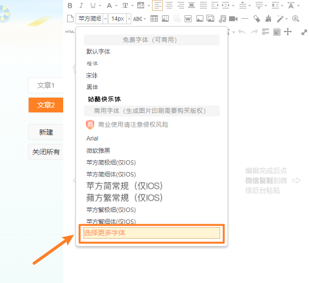 在135編輯器字體工具欄點(diǎn)擊【選擇更多字體】,進(jìn)入字體樣式設(shè)置。