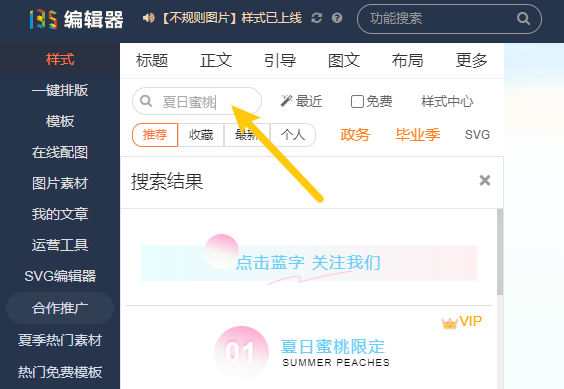 本次上新的夏季通用樣式,一共22個。包含正文、標(biāo)題、圖片、引導(dǎo)關(guān)注、分割線等多種樣式,在135編輯器內(nèi),搜索關(guān)鍵詞:夏日蜜桃,即可使用。