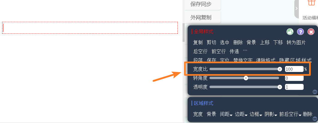 選中空白處(出現(xiàn)紅色框線即代表選中),在彈出菜單欄中選擇寬度比,將寬度比縮??;