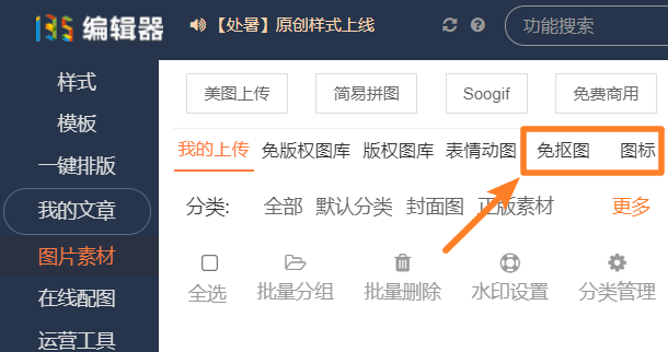 其它的元素圖片可以點(diǎn)擊編輯器左側(cè)菜單欄的圖片素材-免摳圖/圖標(biāo)查找。