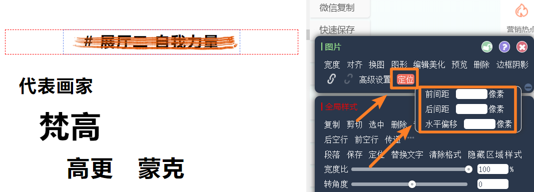 首先選定一個(gè)固定的元素(圖片或文字),然后選中另一個(gè)元素,在彈出菜單欄中選擇『定位』,就可以設(shè)置該元素的前后間距及水平偏移的像素,把該元素放到任意你想放的位置即可。