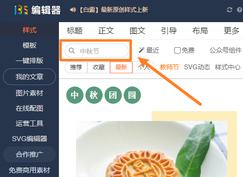 本次上新的中秋節(jié)樣式,一共32個(gè)。包含正文、標(biāo)題、圖片、引導(dǎo)關(guān)注、分割線、二維碼等多種樣式,在135編輯器內(nèi),搜索關(guān)鍵詞:中秋節(jié),即可使用。