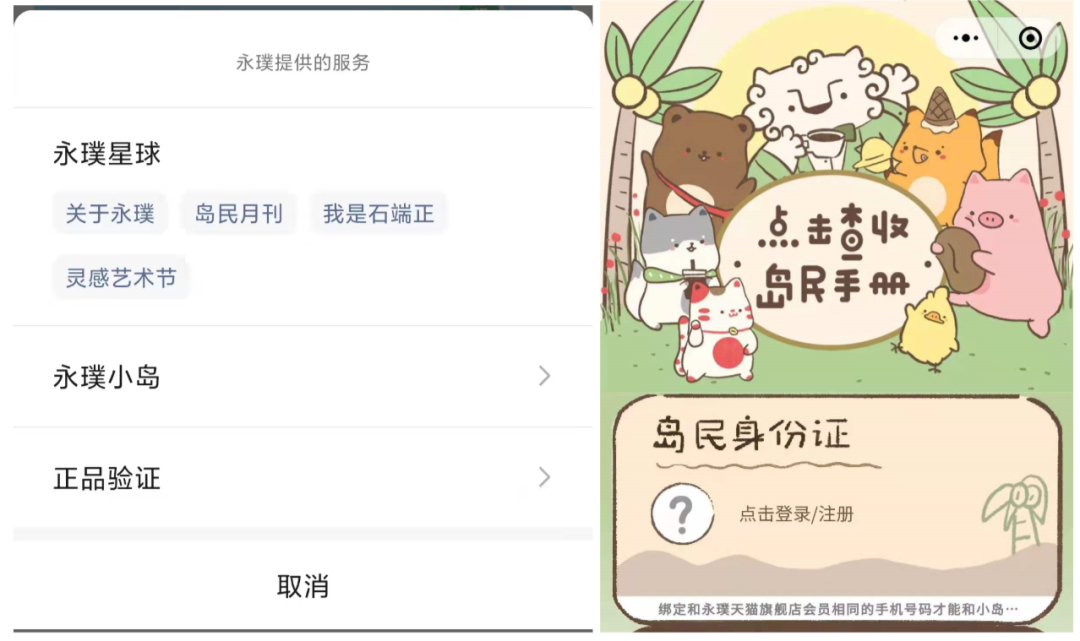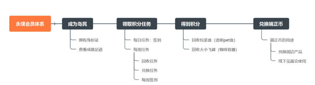關(guān)注永璞公眾號(hào)(服務(wù)號(hào))—— 引導(dǎo)進(jìn)入小程序“永璞小島”——首頁引導(dǎo)注冊(cè)成為“島民”——用戶擁有會(huì)員身份——購買商品/做任務(wù)賺積分—— 成為私域用戶/積分兌換周邊