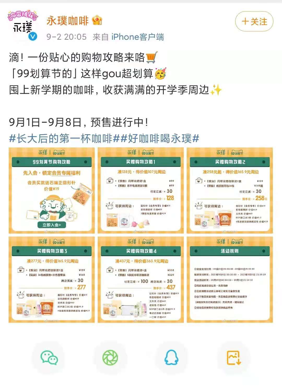 產(chǎn)品為主,內(nèi)容為輔,所有的內(nèi)容是圍繞產(chǎn)品來做的。永璞咖啡無論在內(nèi)容上(公眾號(hào)、短視頻、種草筆記等)輸出的都是企業(yè)想要表達(dá)的價(jià)值觀“熱愛生活、喜歡咖啡,追求高品質(zhì)”,必要要在內(nèi)容和產(chǎn)品、活動(dòng)上體現(xiàn)這個(gè)價(jià)值觀。要讓用戶覺得物超所值,而非價(jià)不配物。同樣是花59元買咖啡,是買一罐速溶還是一套咖啡文化呢。永璞咖啡想通過價(jià)值觀的表達(dá),吸引那些有同樣追求,同樣理想生活的年輕人群,這也是永璞咖啡的主要消費(fèi)群體。