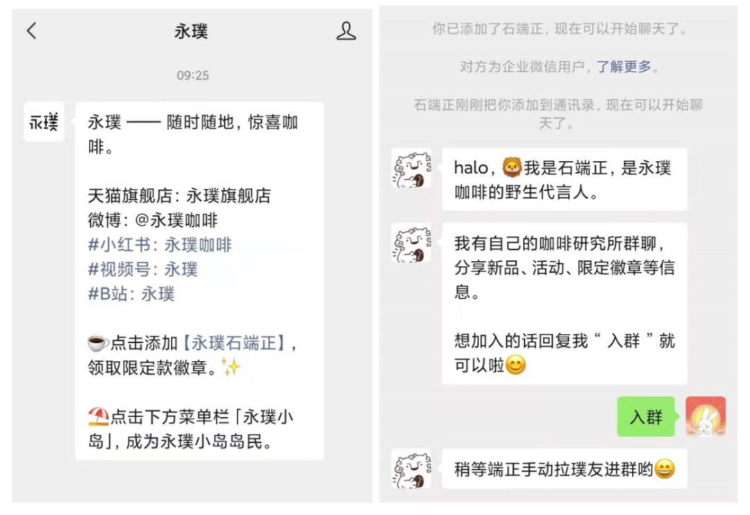 關(guān)注永璞公眾號(hào)(服務(wù)號(hào))—— 引導(dǎo)添加企業(yè)微信“石端正”領(lǐng)取限定款徽章——成功添加企業(yè)微信 —— 回復(fù)“入群”——進(jìn)入企業(yè)微信群“石端正的咖啡生活研究所”