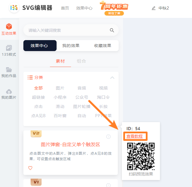 在135樣式/互動(dòng)效果分類下,搜索樣式ID/SVG效果名稱,添加到編輯教程區(qū)域,點(diǎn)擊『查看教程』按照步驟完成即可