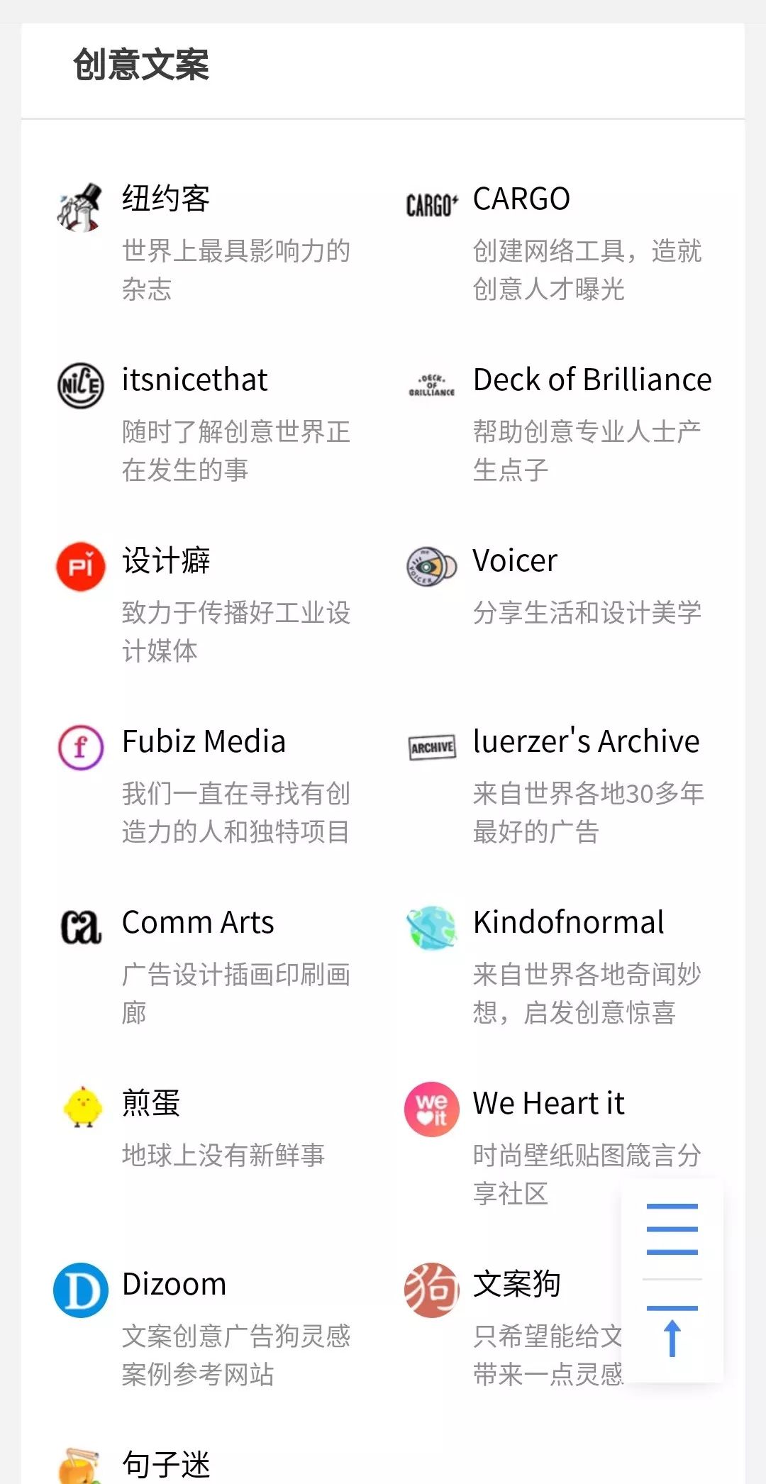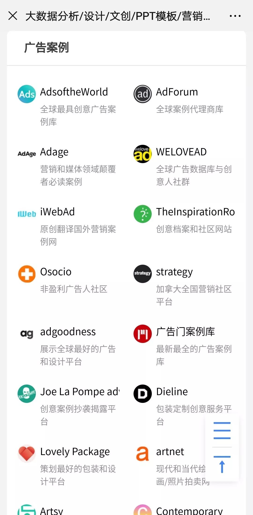 包含了19個(gè)分類欄目,涵蓋 500多個(gè)網(wǎng)址,基本包含所有廣告人日常所需。什么業(yè)內(nèi)資訊、創(chuàng)意設(shè)計(jì)、經(jīng)典案例庫、創(chuàng)意文案、熱搜榜、數(shù)據(jù)洞察、PPT模板、效率工具、創(chuàng)意熱店等等應(yīng)有盡有。