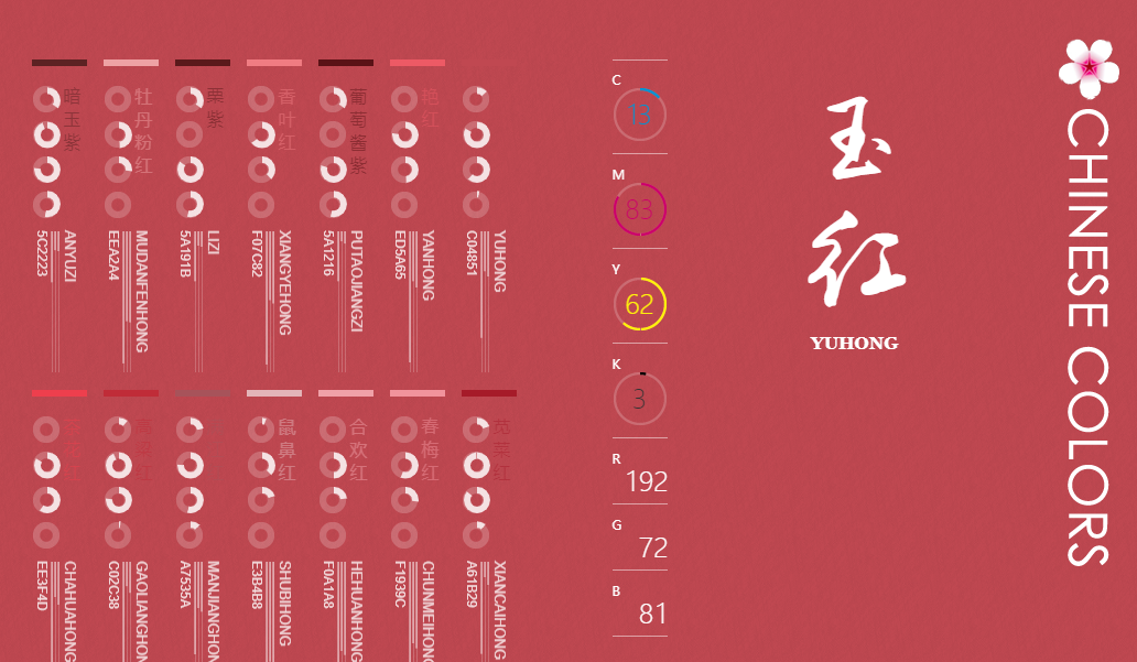 這個(gè)網(wǎng)站我個(gè)人非常之喜歡,就連桌面壁紙也是從這里挑的顏色做的。網(wǎng)站叫中國(guó)色 CHINESE COLORS,顧名思義,這里收錄的都是中國(guó)的傳統(tǒng)顏色。每一種顏色也有一個(gè)好聽的名字,暗玉紫、葡萄醬紫、香葉紅、合歡紅、唐菖蒲紅、飛燕草藍(lán)、蝶翅藍(lán)、月影白、香水玫瑰黃......如果是想找中國(guó)風(fēng)的配色,來這個(gè)網(wǎng)站就對(duì)了,絕不虛此行。