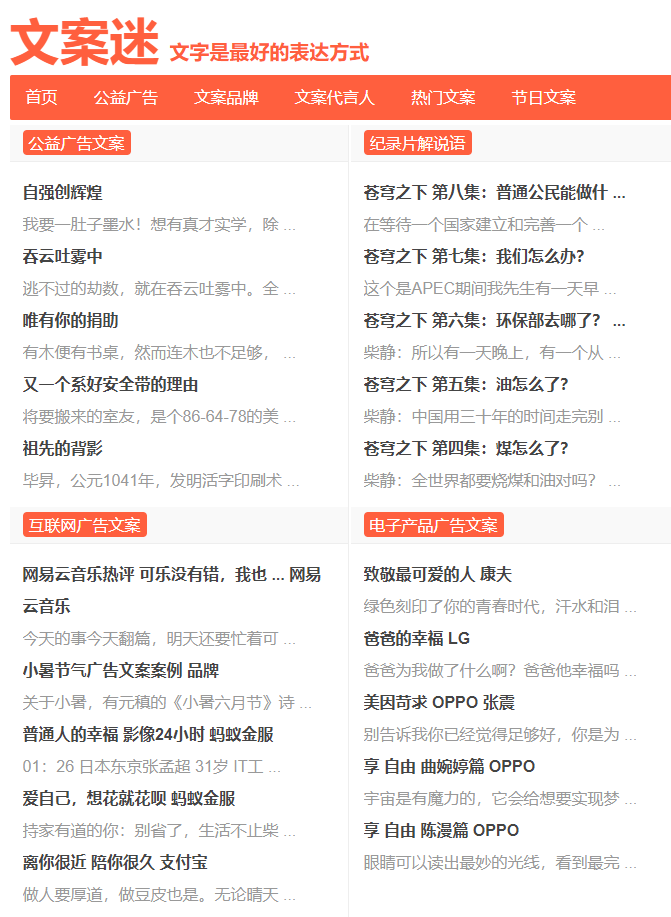 上面匯集了大量好的廣告文案、廣告語、廣告詞、公益文案、熱門文案等等,應(yīng)有盡有,對(duì)于懶人那絕對(duì)是效率神器。他們還為你分門別類的整理好這些文案,想要啥文案都可以來翻翻,簡(jiǎn)單粗暴,用過了就上癮。