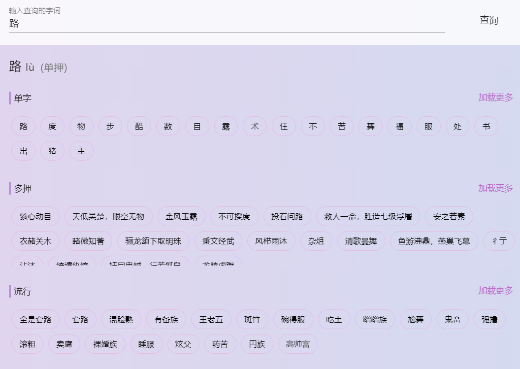 光看名字就會(huì)讓文案人眼前一亮,玩押韻的嘛。這里可以在線查詢押韻的字、詞、詩、歌等,甚至支持尾字雙押、三押、四押。