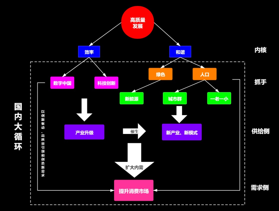 科技創(chuàng)新、科技自主會帶來產(chǎn)業(yè)升級,其中尤以制造業(yè)的升級勢能最大,而產(chǎn)業(yè)升級又會催生新產(chǎn)業(yè)、新模式的產(chǎn)生,那么未來新型消費的崛起也將會勢不可擋。最后再結(jié)合一老一小、城市群等發(fā)展方向,又可以反哺產(chǎn)業(yè)鏈升級和提振消費,最終驅(qū)使國內(nèi)循環(huán)有效暢通。