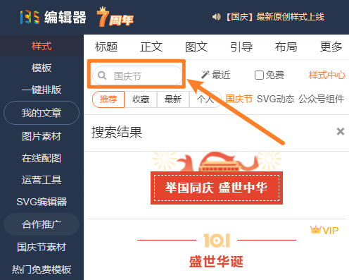 本次上新的國(guó)慶節(jié)樣式,一共39個(gè)。包含正文、標(biāo)題、圖片、引導(dǎo)關(guān)注、分割線、二維碼等多種樣式,在135編輯器內(nèi),搜索關(guān)鍵詞:國(guó)慶節(jié),即可使用。