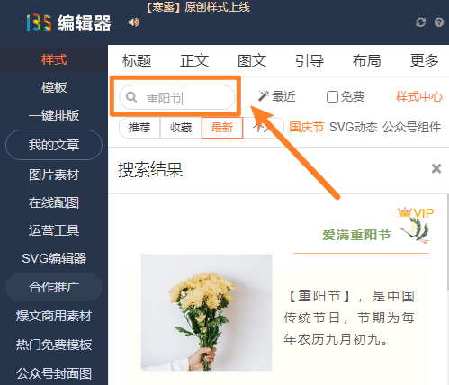 本次上新的重陽節(jié)樣式,一共20個(gè)。包含正文、標(biāo)題、圖片、圖文組合等多種樣式,在135編輯器內(nèi),搜索關(guān)鍵詞:重陽節(jié),即可使用。